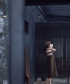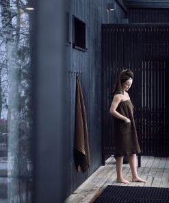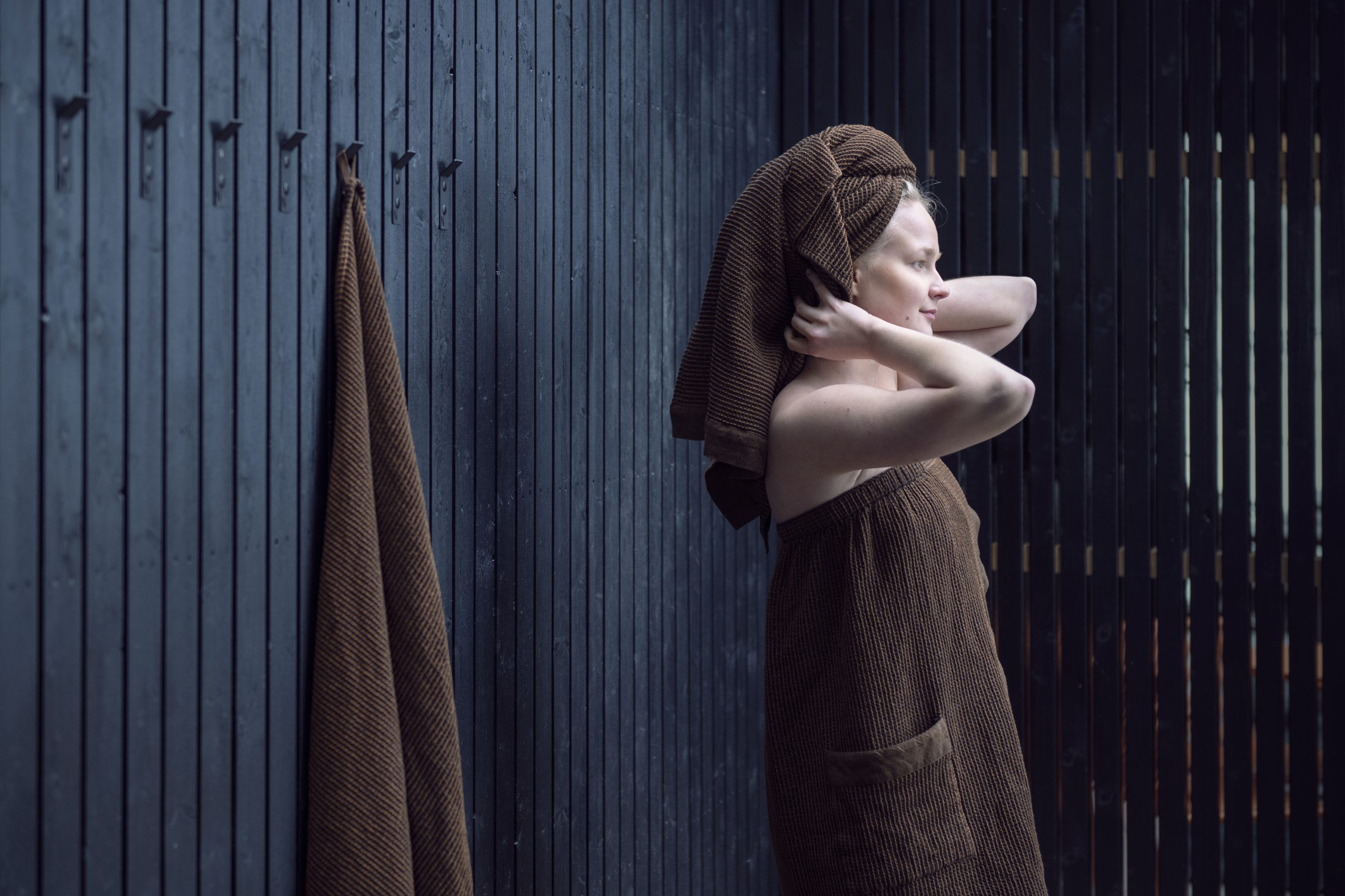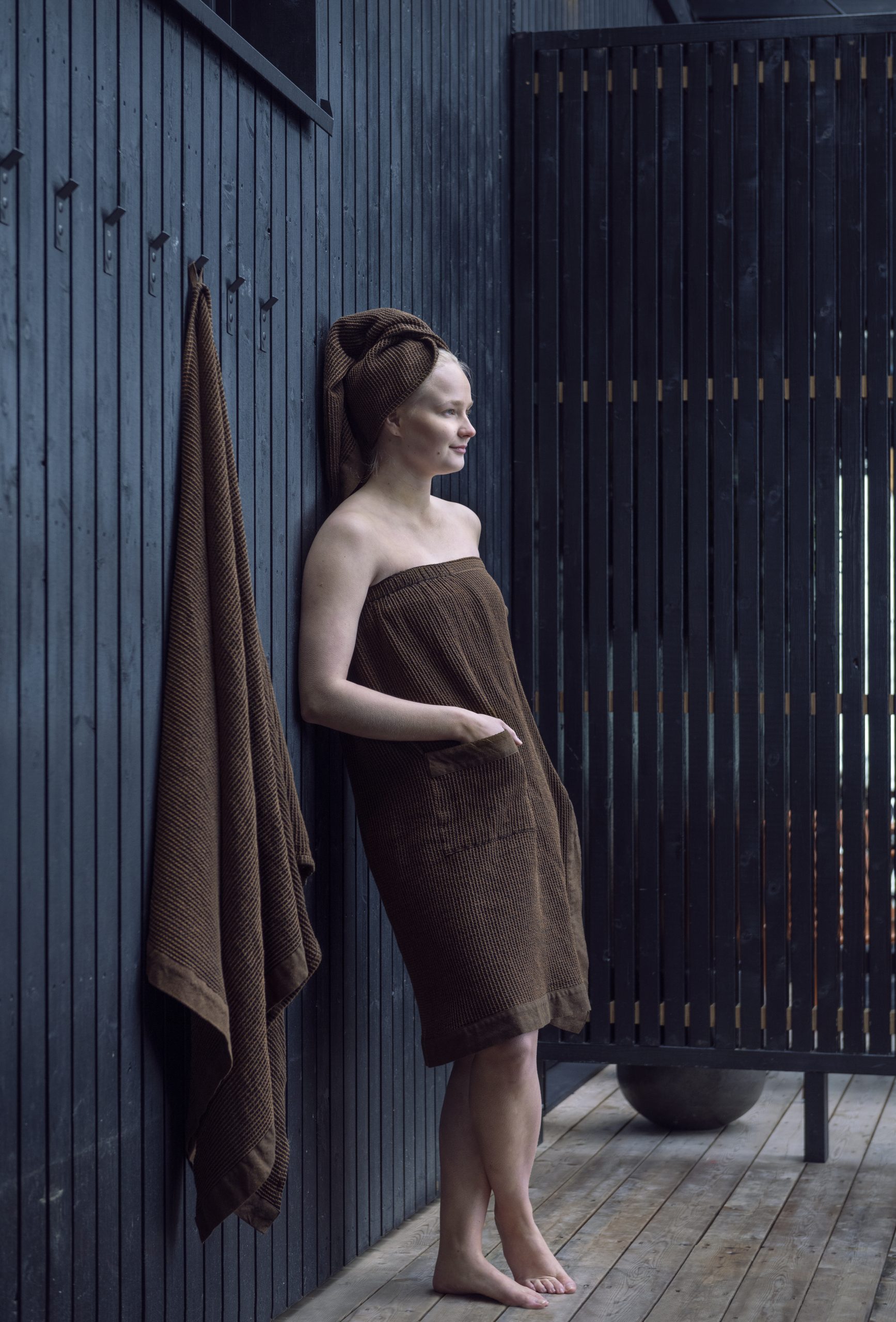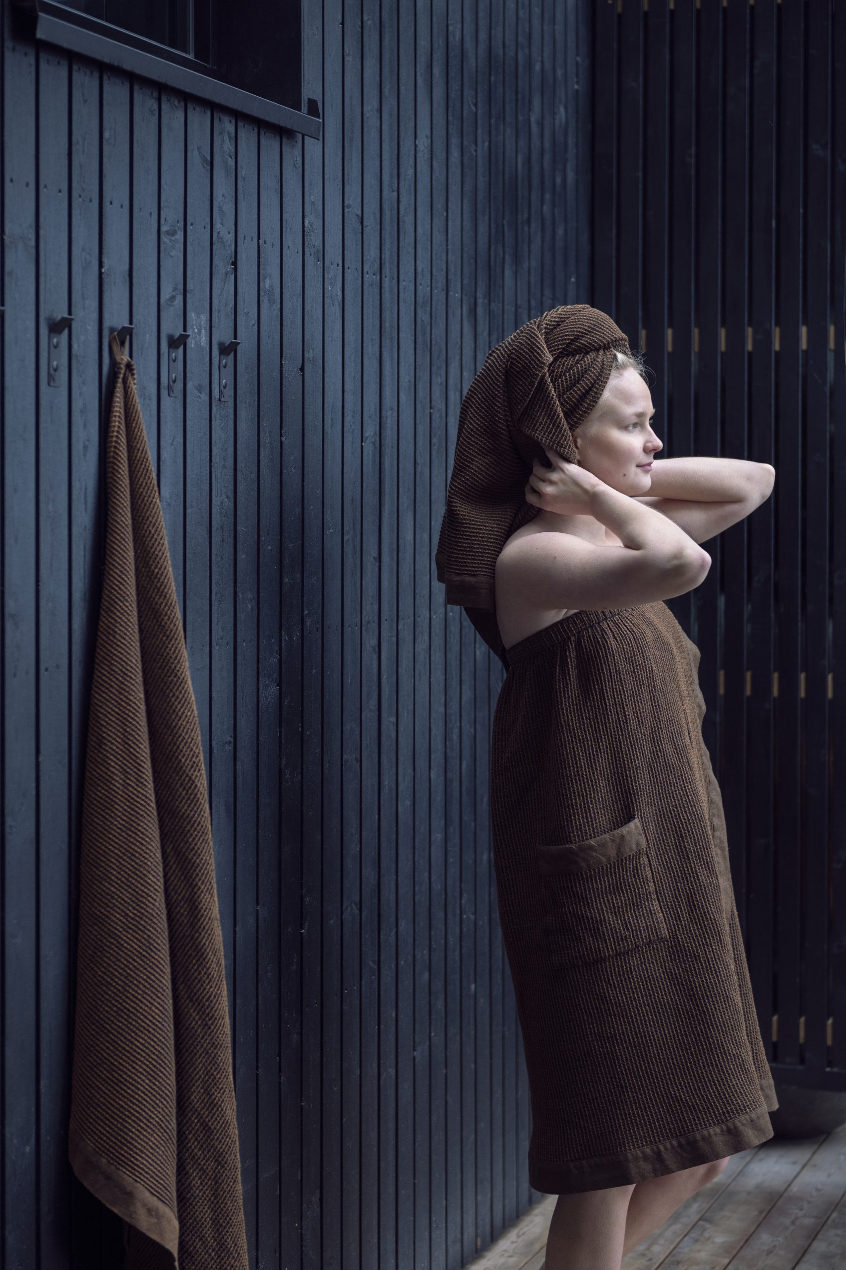 The wrap towel/sarong is a relaxed and easy-to-use accessory for the sauna, spa, swimming pool, or beach. The convenient velcro fastening ensures effortless use and allows for free movement. Wide chambray bindings give the product a finished and inviting look. Made from soft and breathable recycled material, the towel feels pleasant against the skin and dries quickly. Size 85 x 145 cm. Gentle machine wash at 60°C.